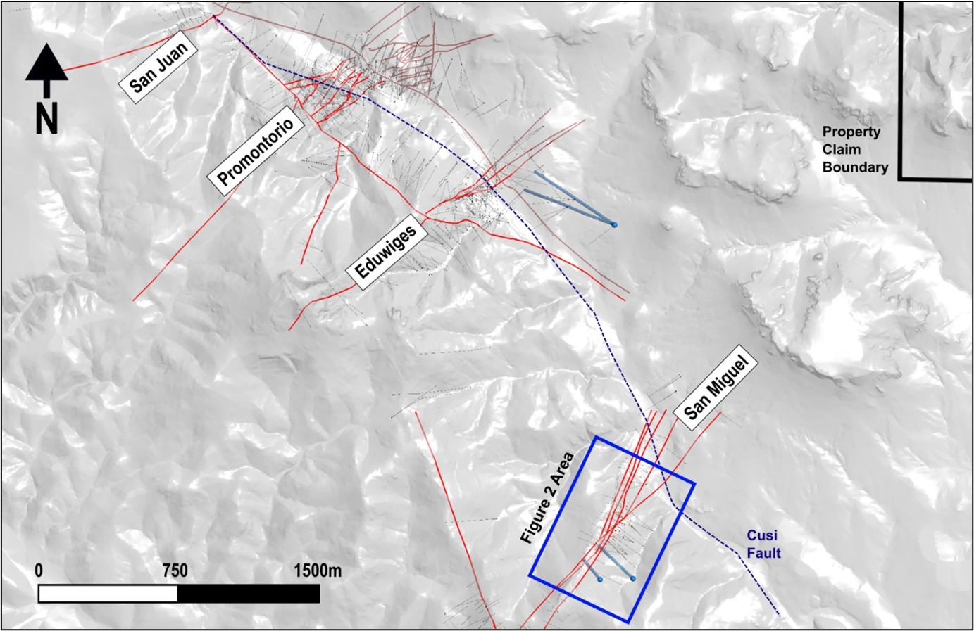 With the acquisition of the Cusi Property, the Company additionally acquired and consolidated two inset claims along the San Miguel vein system. These claims had been in dispute since 2007 and no exploration work had been performed since 2007. This area has a small open pit mine at surface (~30m depth) and minor underground workings from historical mining, assumed to be pre-2000s.