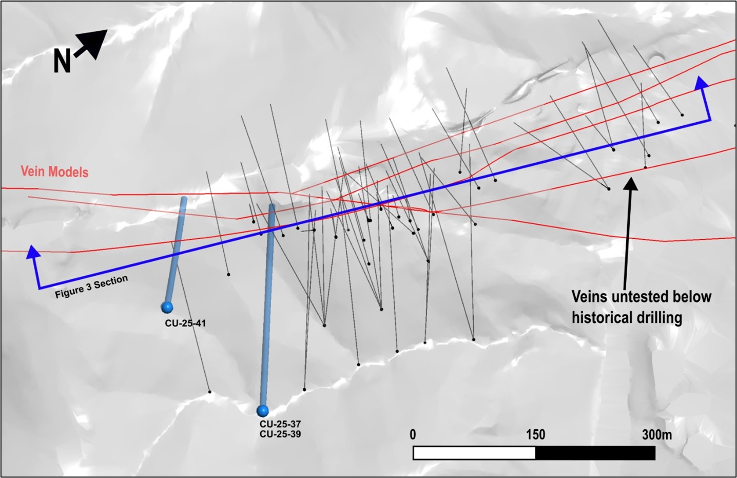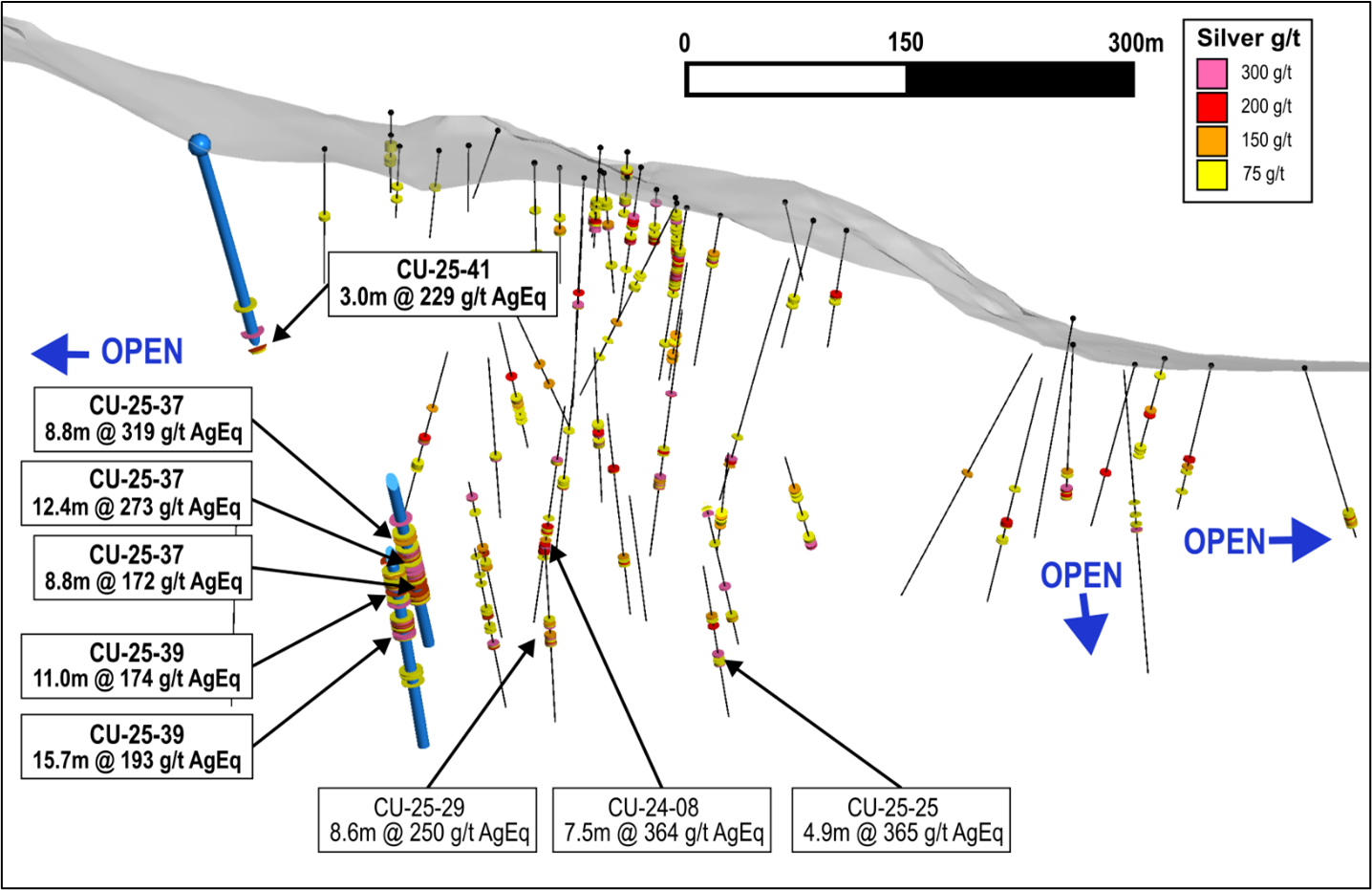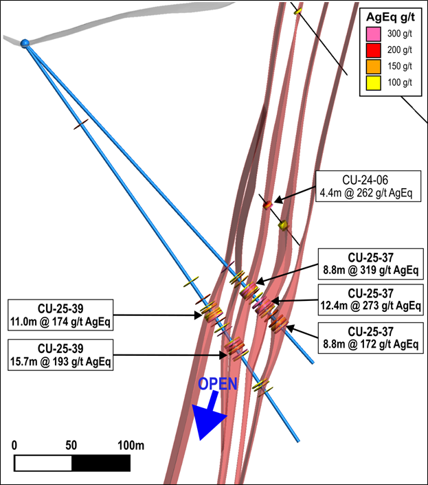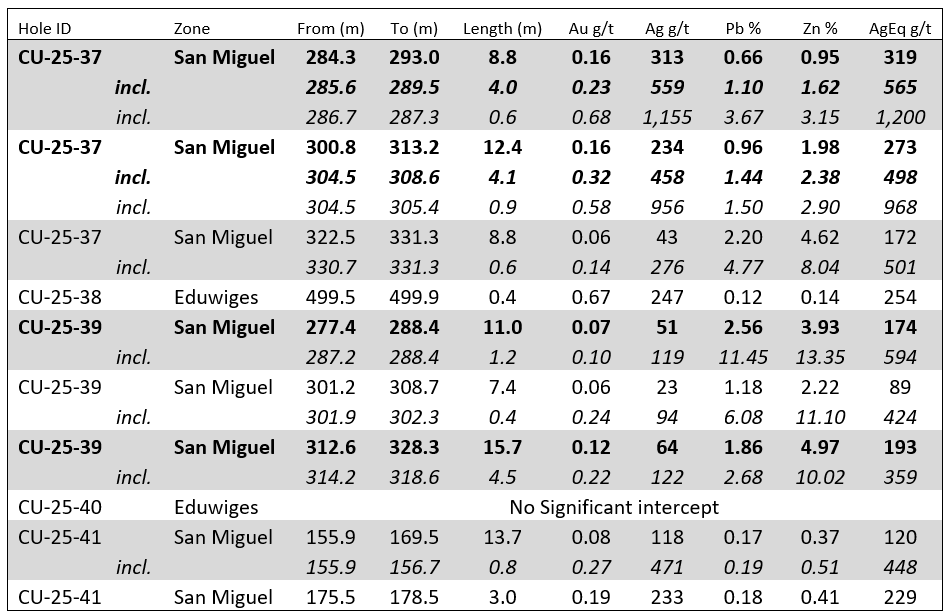 While previous drilling had encountered a single broad vein among multiple other veins across the San Miguel system, these latest results confirm a significant evolution in the geological model: multiple parallel structures are now simultaneously exhibiting broad widths and high grades. Hole CU-25-37 intersected a cluster of mineralization including 12.4 metres grading 273 g/t AgEq, 8.8 metres grading 319 g/t AgEq, and 8.8 metres grading 172 g/t AgEq.
