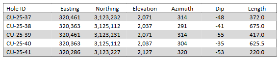 The 2025 program consists of 15,000 metres of surface diamond drilling. The program is approximately two thirds complete. Receipt of assays is expected to continue in the current quarter and into the first quarter of 2026. The 2025 program is primarily focused on following up on the San Miguel results from 2024, with the aim of extending vein along strike and at depth. In addition, some exploratory and infill drilling of the downthrown blocks on the property are planned. Drilling was performed from surface by a local contractor, utilizing portable drill rigs. All core was HQ in size for holes up to 400 metres in depth. Any holes beyond this depth were switched to NQ upon reaching 400 metres.