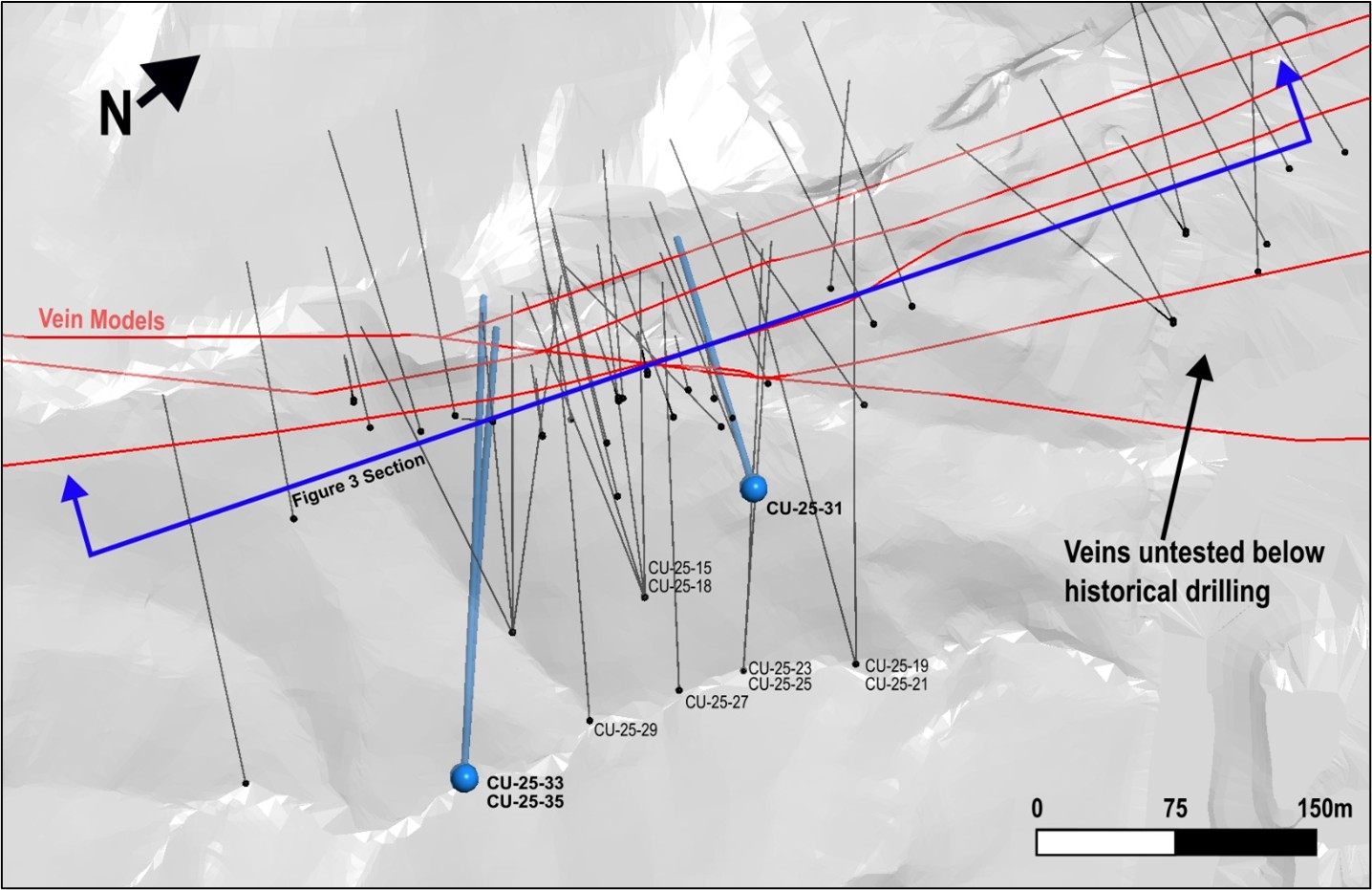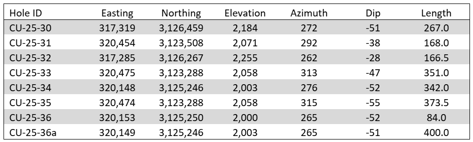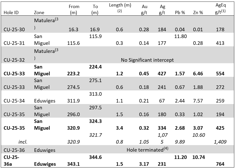 Ongoing drilling at San Miguel has continued to successfully expand the vein system, extending the vein to the southwest by approximately 50 metres. Hole CU-25-35 intersected 3.4 metres of 425 g/t AgEq at a similar depth as the previously released CU-25-29’s 8.6 metres of 250 g/t AgEq. The high-grade intercept in CU-25-33 with 1.2 metres of 554 g/t AgEq was also at a similar depth to CU-25-29’s high grade 2.1 metres of 1,042 g/t AgEq.