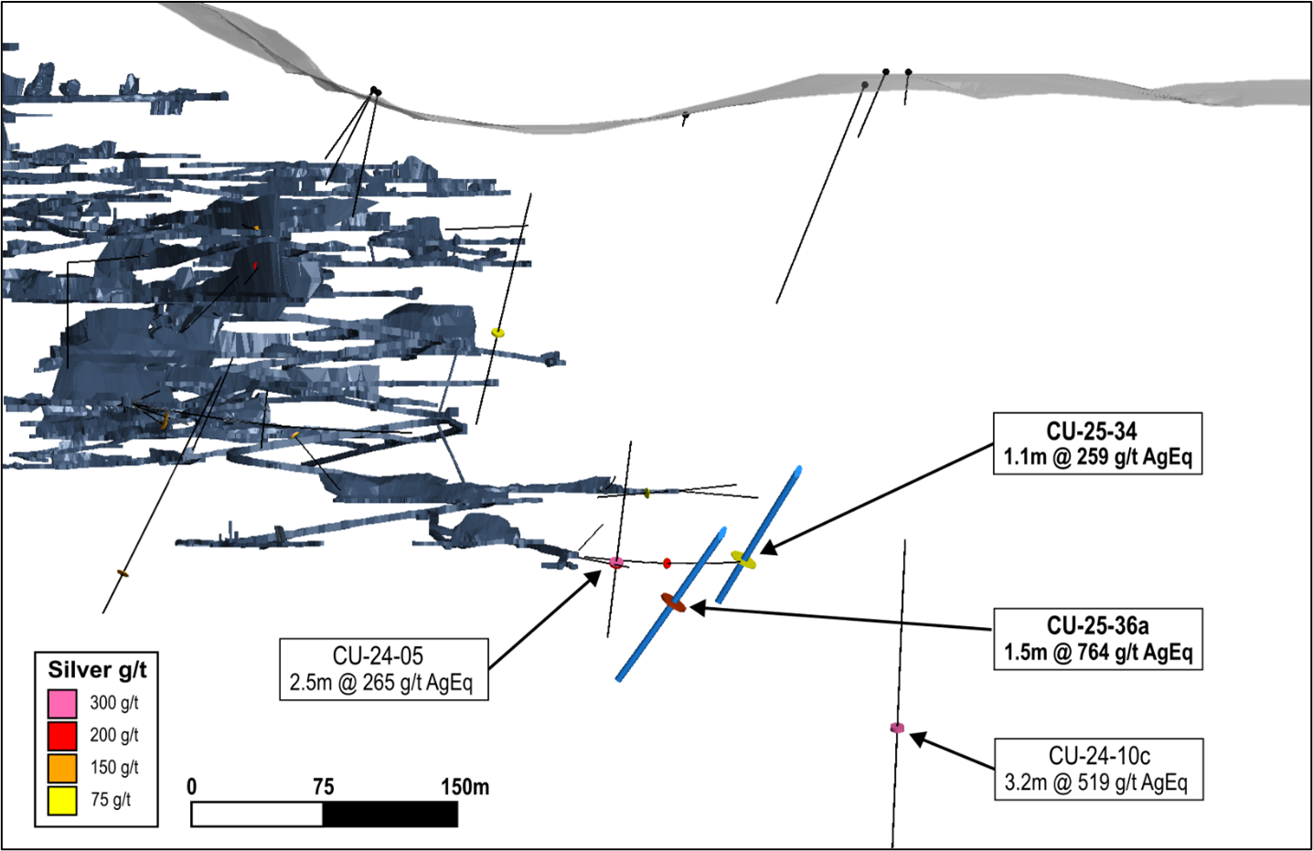 • 764 g/t AgEq over 1.5 metres
