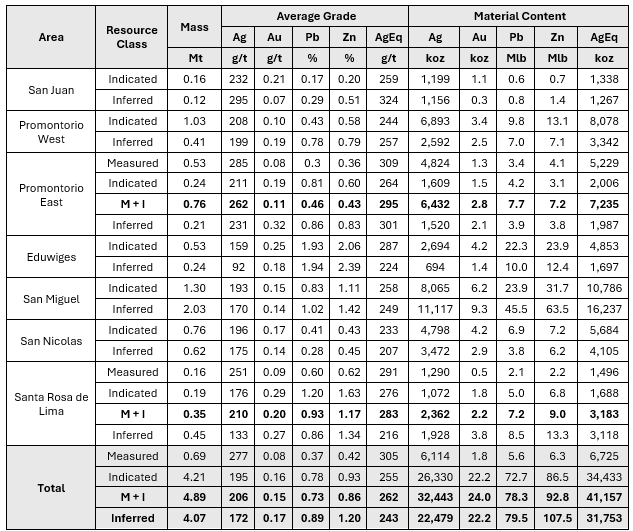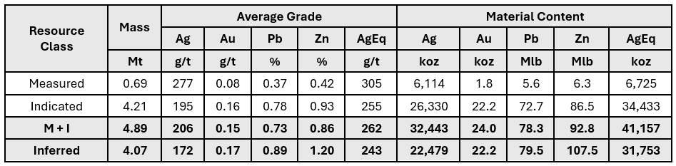 - Combined Measured and Indicated Mineral Resources are estimated at 4.89 Mt grading 206 g/t silver, 0.15 g/t gold, 0.73% lead, and 0.86% zinc (262 g/t AgEq). The Mineral Resource Estimate includes Measured Mineral Resources of 6.1 Moz of silver, 1.8 koz of gold, 5.6 Mlbs of lead, and 6.3 Mlbs of zinc (6.7 Moz of AgEq) and Indicated Mineral Resources of 26.3 Moz of silver, 22.2 koz of gold, 72.7 Mlbs of lead, and 86.5 Mlbs of zinc (34.4 Moz of AgEq).