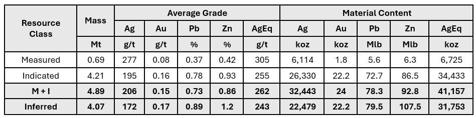 - Combined Measured and Indicated Mineral Resources are estimated at 4.89 Mt grading 206 g/t silver, 0.15 g/t gold, 0.73% lead, and 0.86% zinc (262 g/t AgEq). The Mineral Resource Estimate includes Measured Mineral Resources of 6.1 Moz of silver, 1.8 koz of gold, 5.6 Mlbs of lead, and 6.3 Mlbs of zinc (6.7 Moz of AgEq) and Indicated Mineral Resources of 26.3 Moz of silver, 22.2 koz of gold, 72.7 Mlbs of lead, and 86.5 Mlbs of zinc (34.4 Moz of AgEq).
