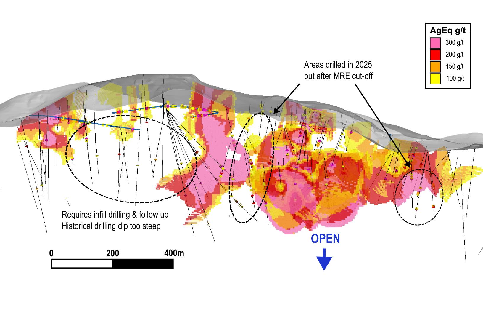 San Miguel has become a cornerstone resource for the Cusi Project, boasting Indicated resources of 1.3 million tonnes at 258 g/t AgEq and Inferred resources of 2.03 million tonnes at 249 g/t AgEq. The 2026 surface drilling campaign will look beyond the current resource boundaries, aggressively testing both the lateral and vertical extents of the deposit. This aims to unlock significant upside, as historical drilling on the western edges failed to properly intersect the vein due to being drilled at too steep of a dip or without sufficient step-backs.