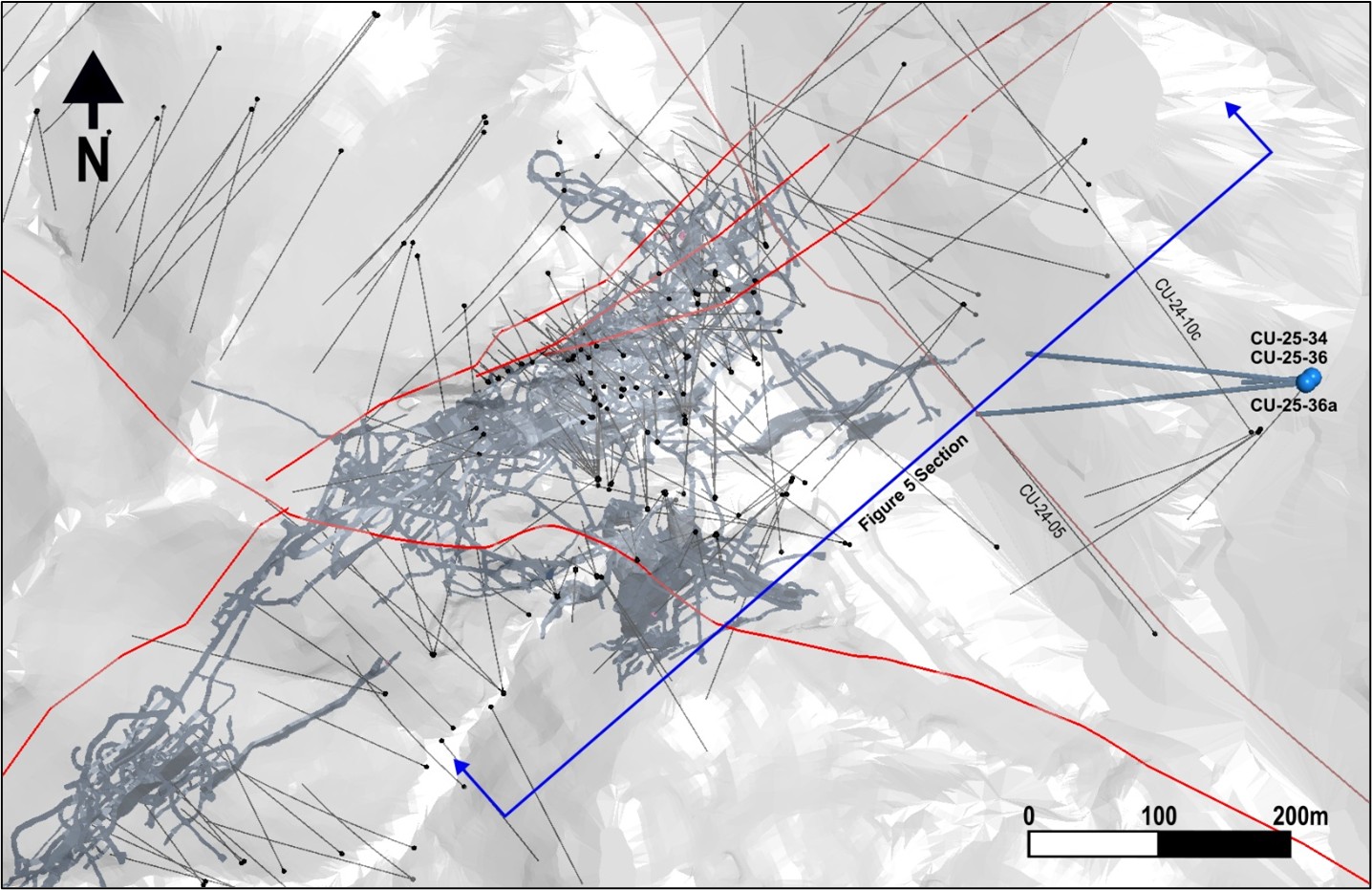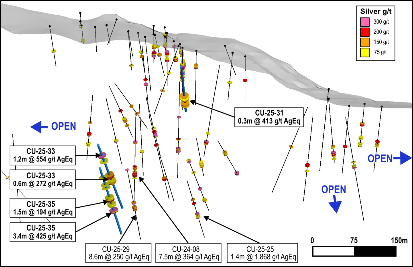 Ongoing drilling at San Miguel has continued to successfully expand the vein system, extending the vein to the southwest by approximately 50 metres. Hole CU-25-35 intersected 3.4 metres of 425 g/t AgEq at a similar depth as the previously released CU-25-29’s 8.6 metres of 250 g/t AgEq. The high-grade intercept in CU-25-33 with 1.2 metres of 554 g/t AgEq was also at a similar depth to CU-25-29’s high grade 2.1 metres of 1,042 g/t AgEq.